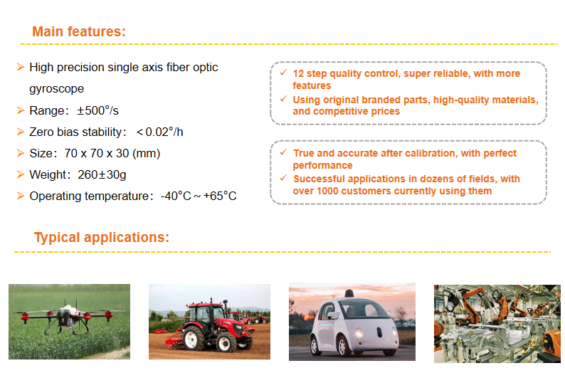 The XUAN-F70 single axis fiber optic gyroscope canbe applied to high-precision inertial navigationsystems such as land positioning and orientation,vehicle mounted north finder, airborne attitude, andmarine gyro compass.