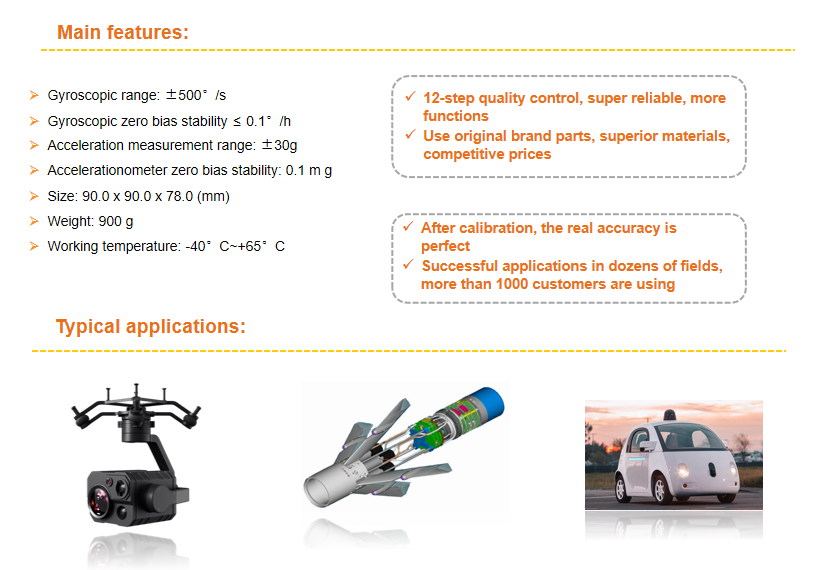 In addition, it has three high-precision quartz accelerometers builtin, which can accurately measure the three-axis accelerationinformation and three-axis angular velocity information of thecarrier, and output at high speed and stably through RS-422serial port.