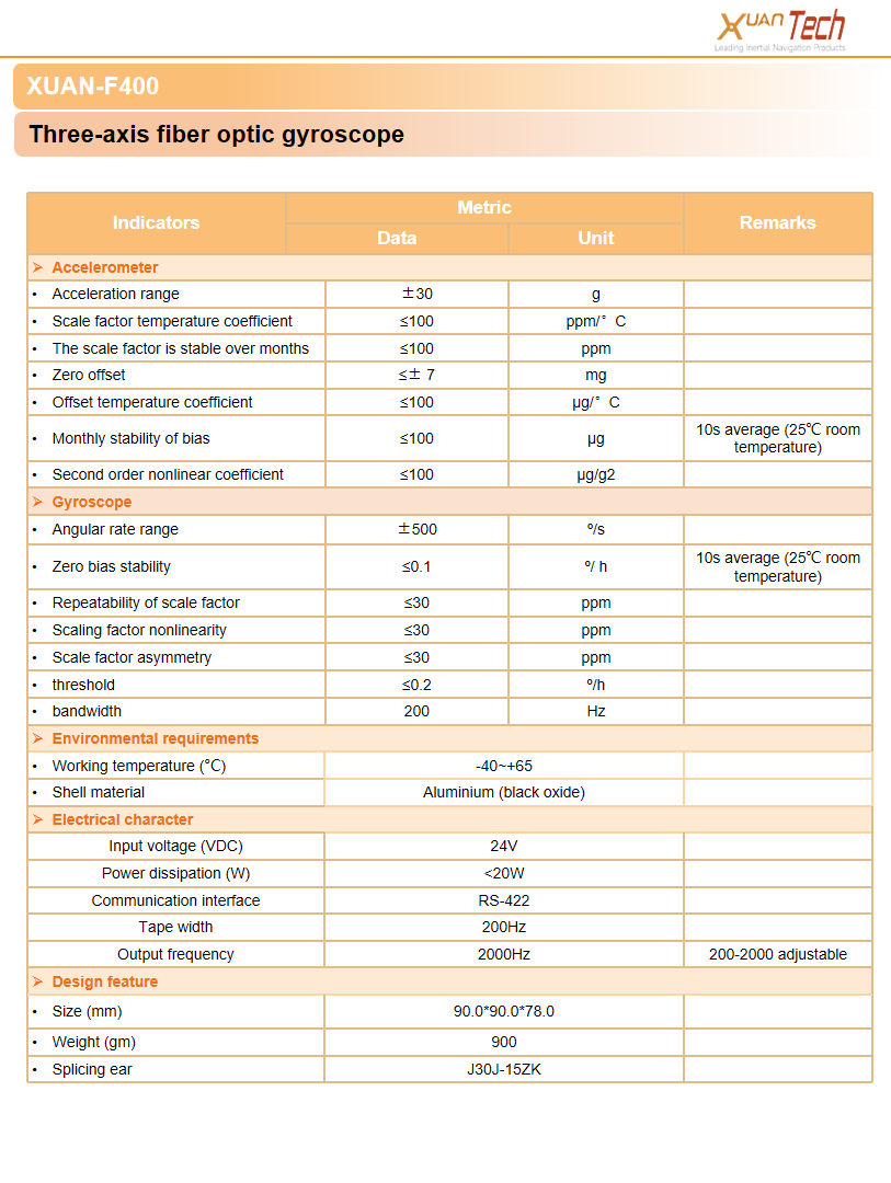 XUAN-F400 optical fiber inertial measurement unit is designedfor the needs of medium precision application background, usingunique three-axis common technology design, low cost, stableperformance, in terms of structure, the optical path and circuit areintegrated packaging, simple structure, easy installation, fast start,wide measurement range and high reliability