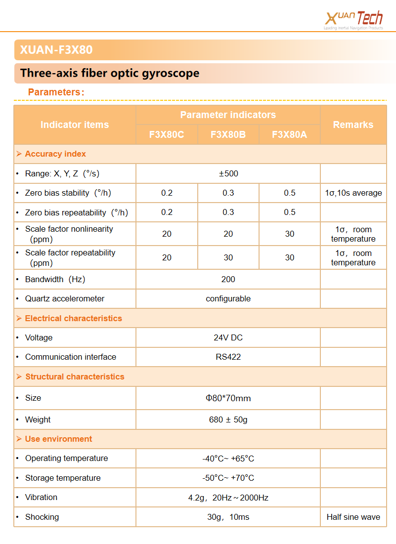 XUAN-F3X80 is an inertial product. lt consists ofthree all solid state fiber optic gyroscopes and a datapackaging board. it measures the angular velocity ofthe carrier's motion, providing information for thecarrier's attitude and navigation control. Themeasurement results are output through the RS422serial port.