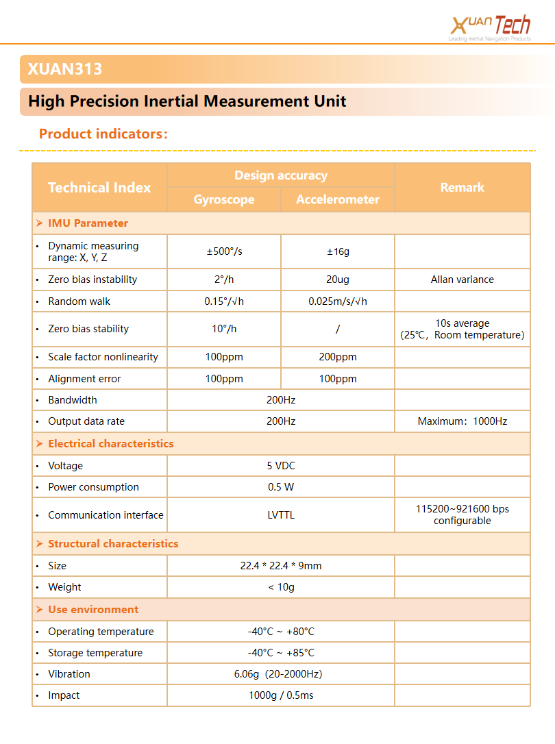 XUAN313 High performance inertial measurementunit is a durable industrial inertial navigation systemwith 6-axis output, acceleration, angular speedoutput frequency of 200 HZ.XUAN313 MEMS basedaccelerometer and gyroscope to provide customerswith cost-effective solutions.
