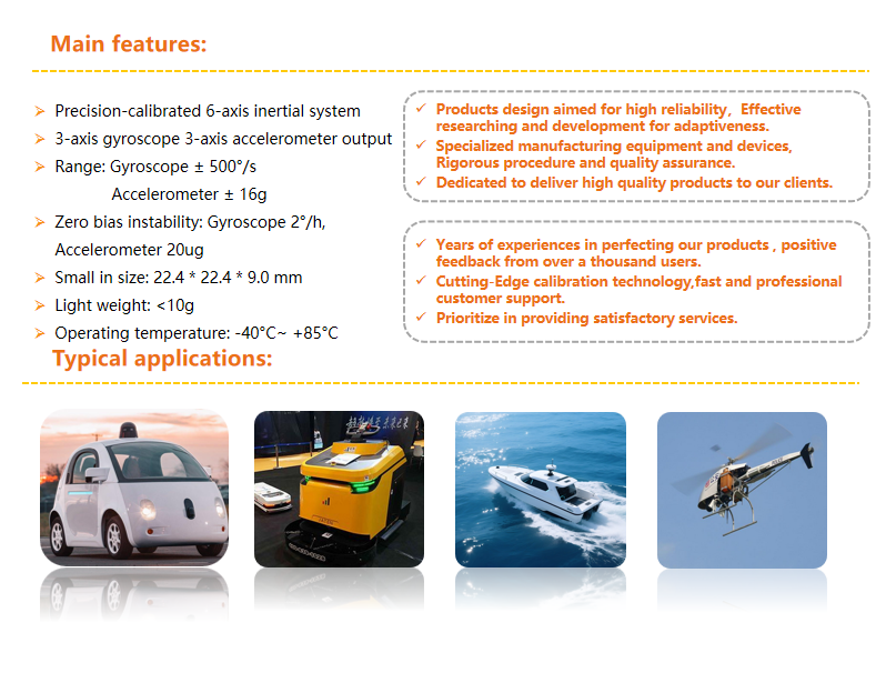 XUAN313 lnertial measurement unit is small size,light weight, using super durable, compact aluminumalloy shell, has high reliability, has been widely usedin unmanned aircraft and ROVs, unmanned aircraft,intelligent agriculture, mechanical control dynamiccontrol system and attitude system, platform stability,AGV, robot and other fields.