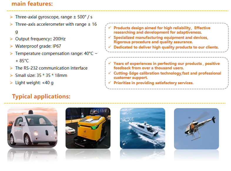 XUAN466 lnertial measurement unit is small in size,light in weight, using ultra-durable, compactaluminum alloy shell, has high reliability in harshenvironment, has been widely used in unmannedaircraft and ROVs, unmanned aircraft, intelligentagriculture, mechanical control and other dynamiccontrol system and attitude system, platformstability, AGV, robot, etc.