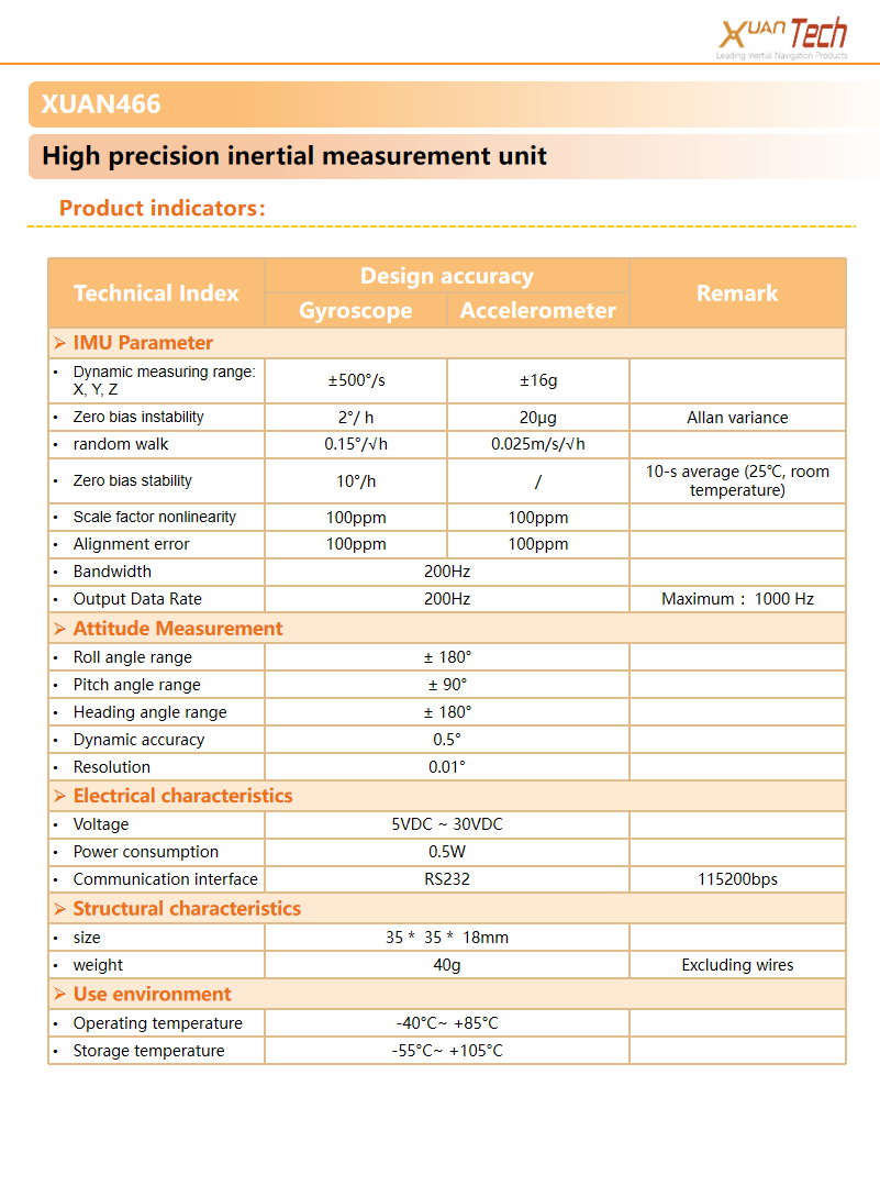 XUAN466 High-performance inertial measurementunit is a durable industrial inertial navigationsystem, using MEMS based accelerometer andgyroscope, to provide customers with super cost-effective solutions.