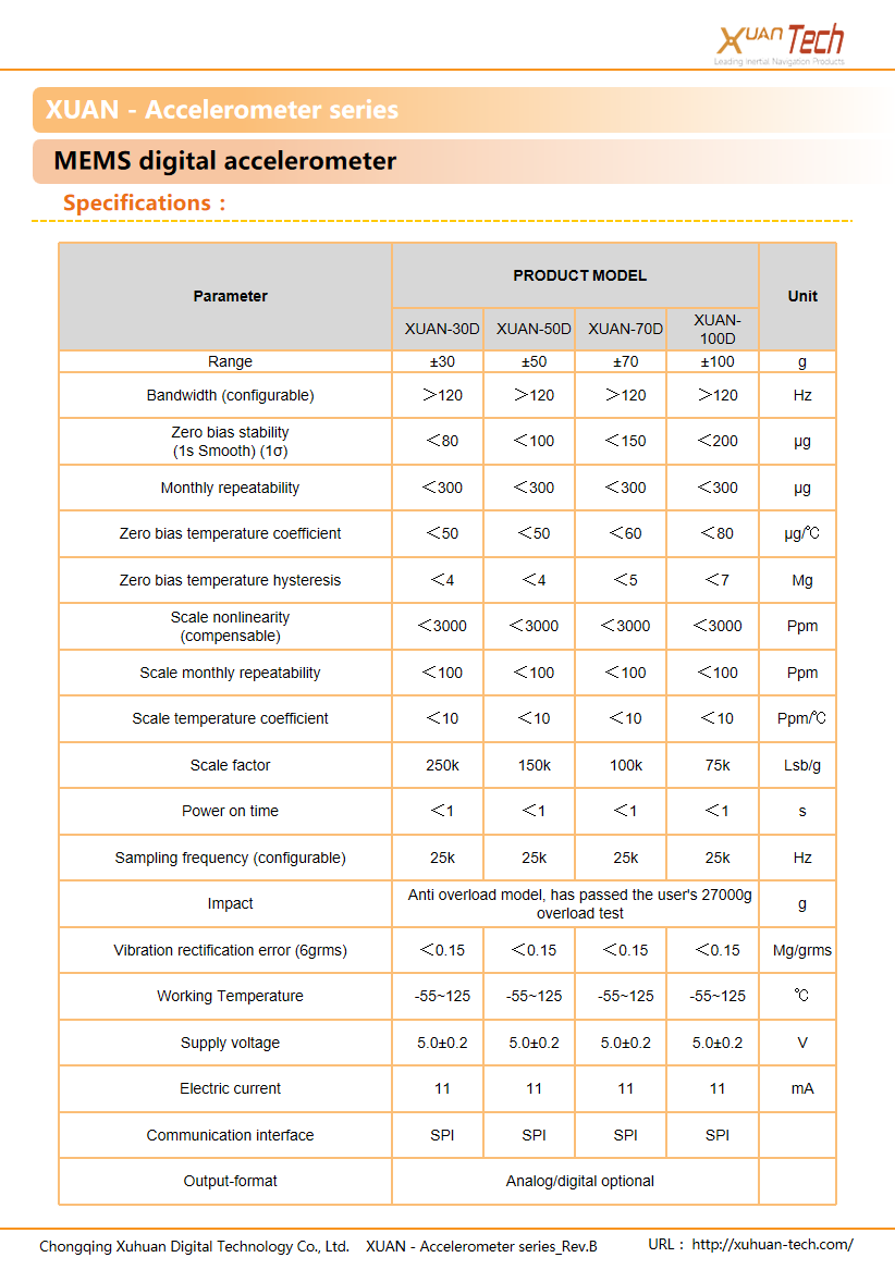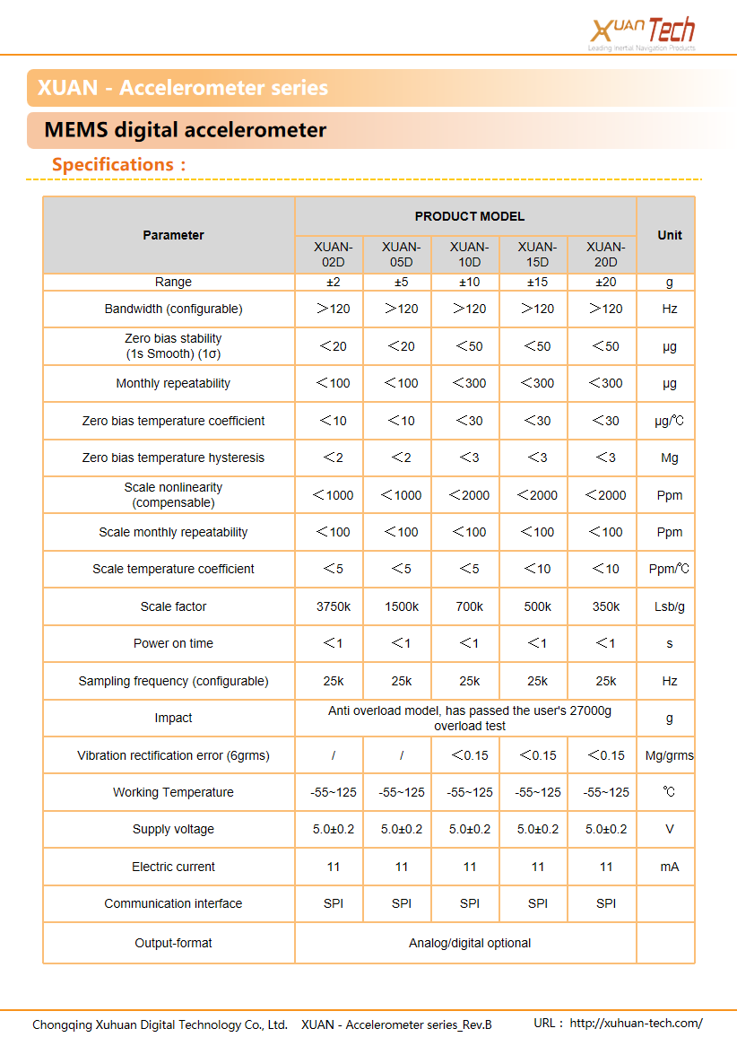 XUAN -Accelerometer series is a digital output MEMSaccelerometer based on MEMS processing technology, highperformance ASlC and MEMS sensitive components, singlepower supply (5V), typical low power consumption (11 mA).