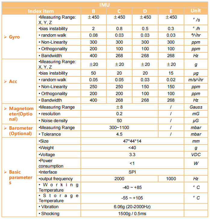 XUAN-630 High performance inertial measurement unit is a durable industrial inertial navigation systemwith 6-axis output, based accelerometer and gyroscope to provide customers with cost-effective solutions.XUAN-630 lnertial measurement unit is small size,light weight, using super durable, compact aluminumalloy shell, has high reliability, has been widely usedin unmanned aircraft and ROVs, unmanned aircraft,intelligent agriculture, mechanical control ,AGV, robot and other fields.