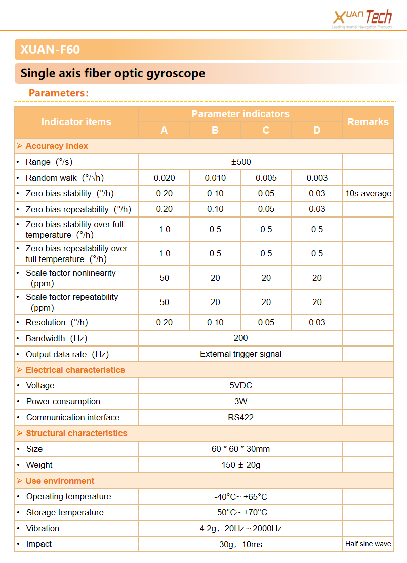 The XUAN-F60 single axis fiber optic gyroscope canbe applied to high-precision inertial navigationsystems such as land positioning and orientation,vehicle mounted north finder, airborne attitude, andmarine gyro compass.