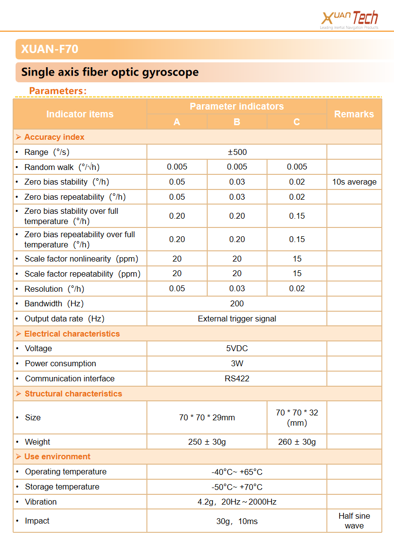 The XUAN-F70 single axis fiber optic gyroscope canbe applied to high-precision inertial navigationsystems such as land positioning and orientation,vehicle mounted north finder, airborne attitude, andmarine gyro compass.