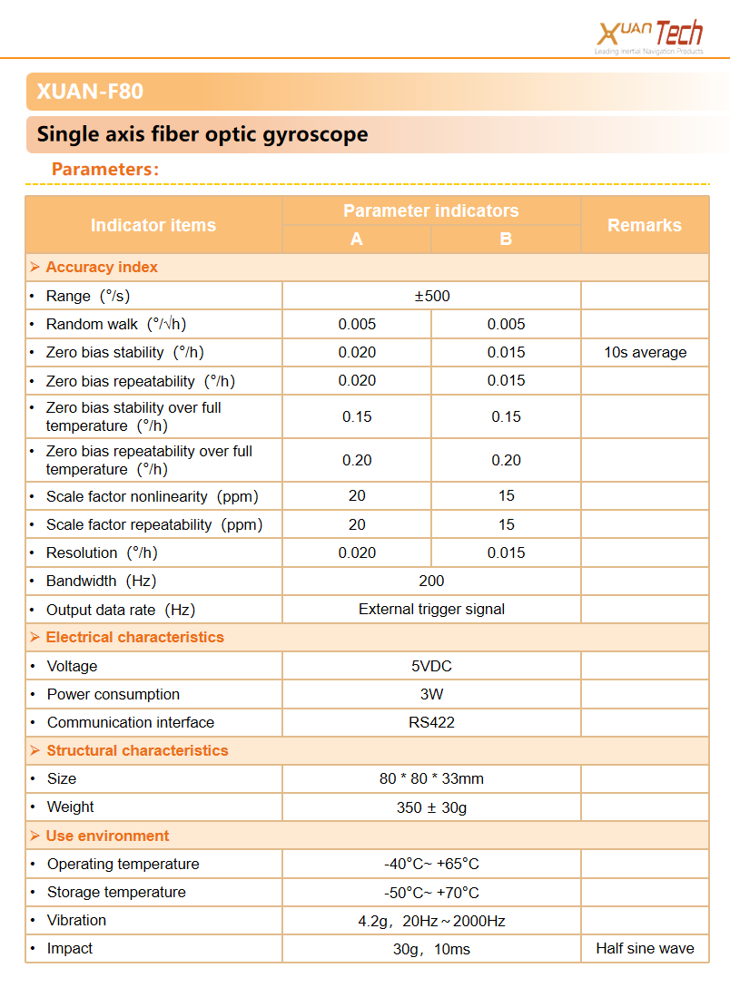 The XUAN-F80 single axis fiber optic gyroscope canbe applied to high-precision inertial navigationsystems such as land positioning and orientation,vehicle mounted north finder, airborne attitude, andmarine gyro compass