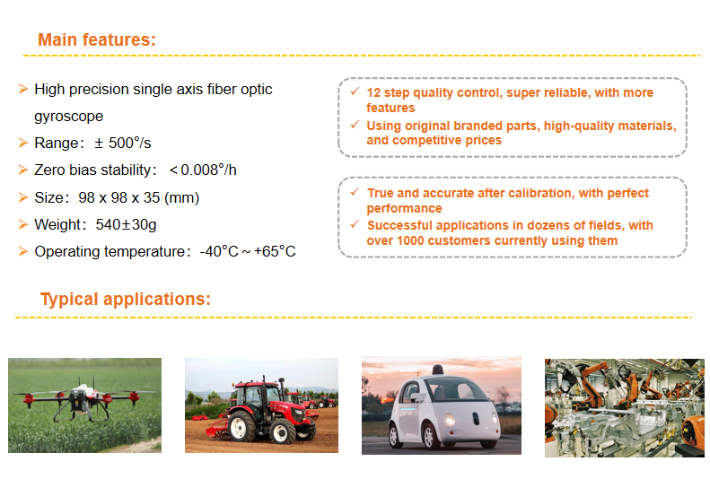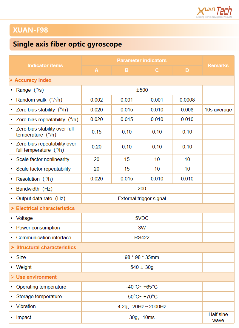 The XUAN-F98 single axis fiber optic gyroscopecan be applied to high-precision inertial navigationsystems such as land positioning and orientation,vehicle mounted north finder, airborne attitude, and marine gyro compass.