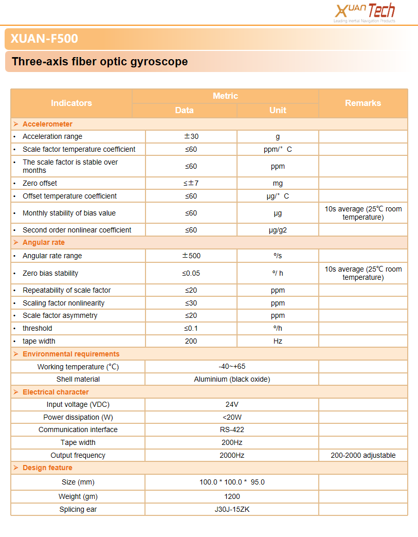 XUAN-F500 optical fiber inertial measurement unit is designed for the needs of medium precision application background, using unique three-axis common technology design, low cost, stable performance; in the structure, optical path and circuit areintegrated packaging, simple structure, easy installation, fast startwide measurement range and high reliability and other advantages.