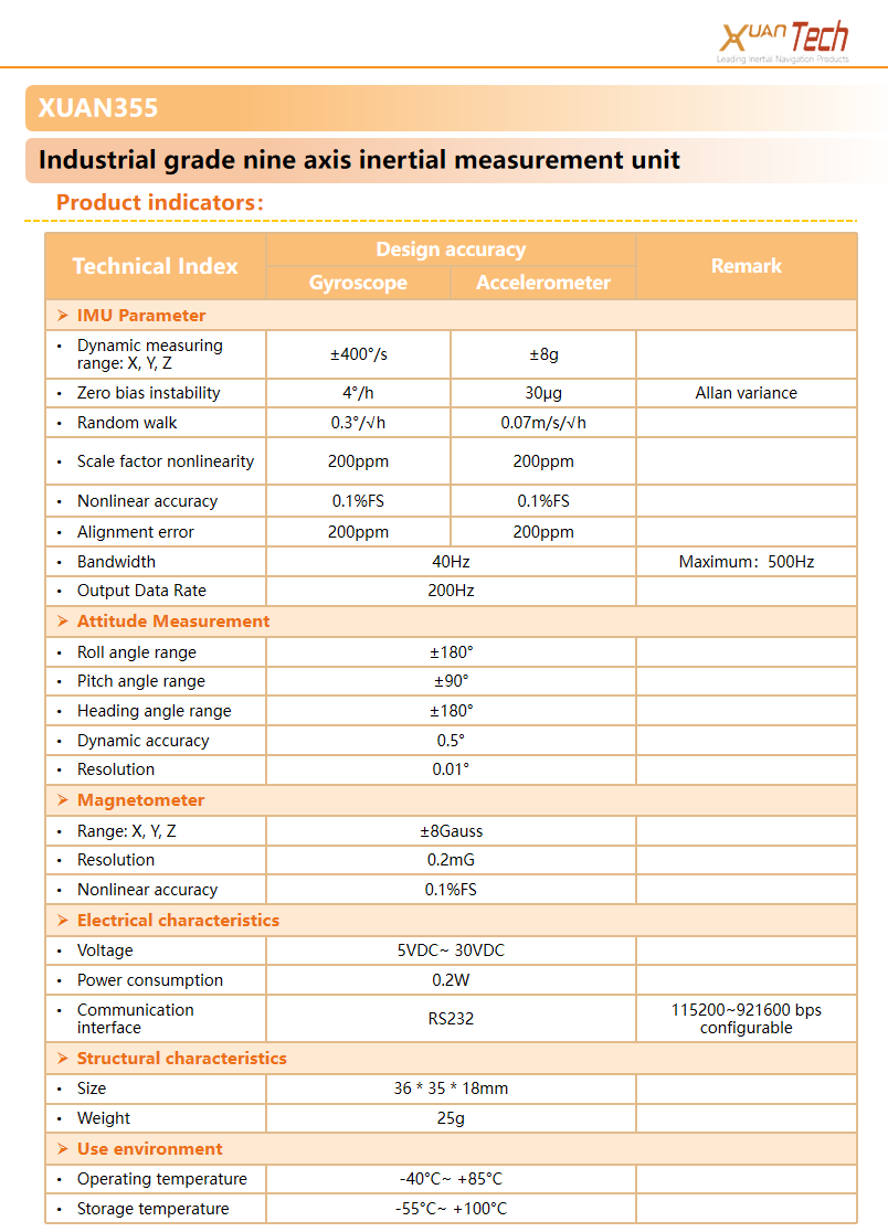 XUAN-355 high-performance inertial measurement unit is a durable industrial-class, inertial navigation system with nine-axis output, including three axis acceleration,three axis angular speed and three axis magnetometer while providing attitude output frequency of 200Hz.