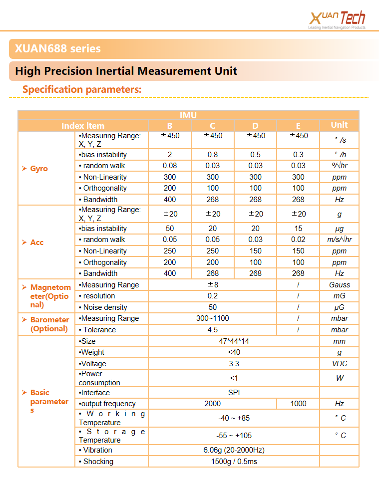 The XUAN688 series lMU are equipped with built -in three - axis gyroscopes and three - axis accelerometers, which are used to measure the three - axis angular rates and three - axis accelerations of the carrier. They can be used for precise navigation, control, and dynamic measurement of the carrier. This productuses high -precision MEMS inertial devices, featuring small size, strong overload resistance, high reliability, and high hardness.