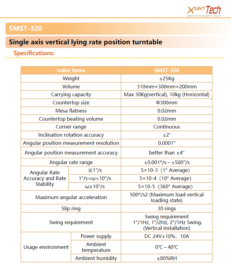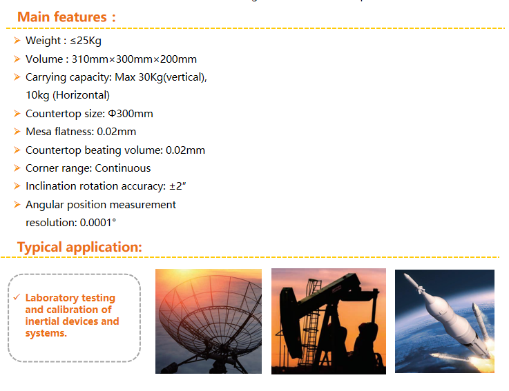 The mechanical and electrical control system of the turntable adopts an integrated structural design. It is a special precision equipment developed for the research and tests, production debugging and maintenance calibration of fibre-optic gyroscopes, accelerometers and IMU. It is mainly used for rate, position and swing function tests, can stand and lie dual-purpose, with small size, low cost, stable performance, reliable operation and simple operation. It can also be used for the testing of other inertial components and devices.