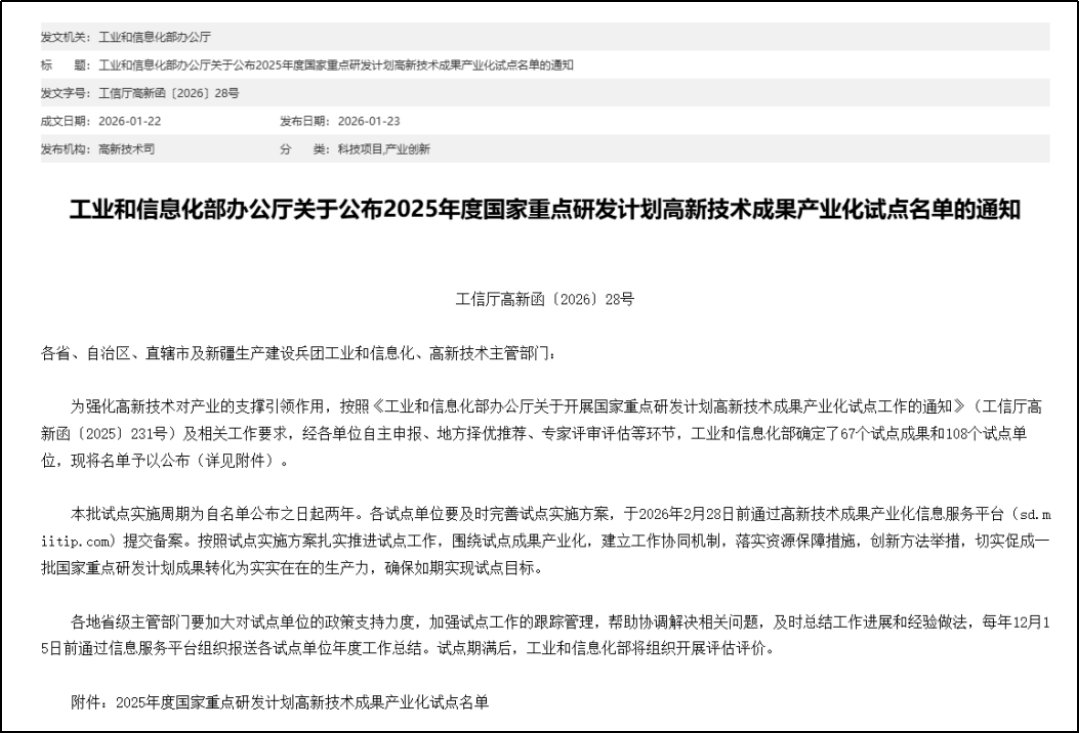 On January 23, the Ministry of Industry and Information Technology (MIIT) issued the Notice of the General Office of the Ministry of Industry and Information Technology on Announcing the 2025 Annual National Key R&D Program High-Tech Achievement Industrialization Pilot List. In the notice, 67 pilot achievements and 108 pilot entities for the industrialization of high-tech achievements under the 2025 Annual National Key R&D Program were announced, with the following requirements: